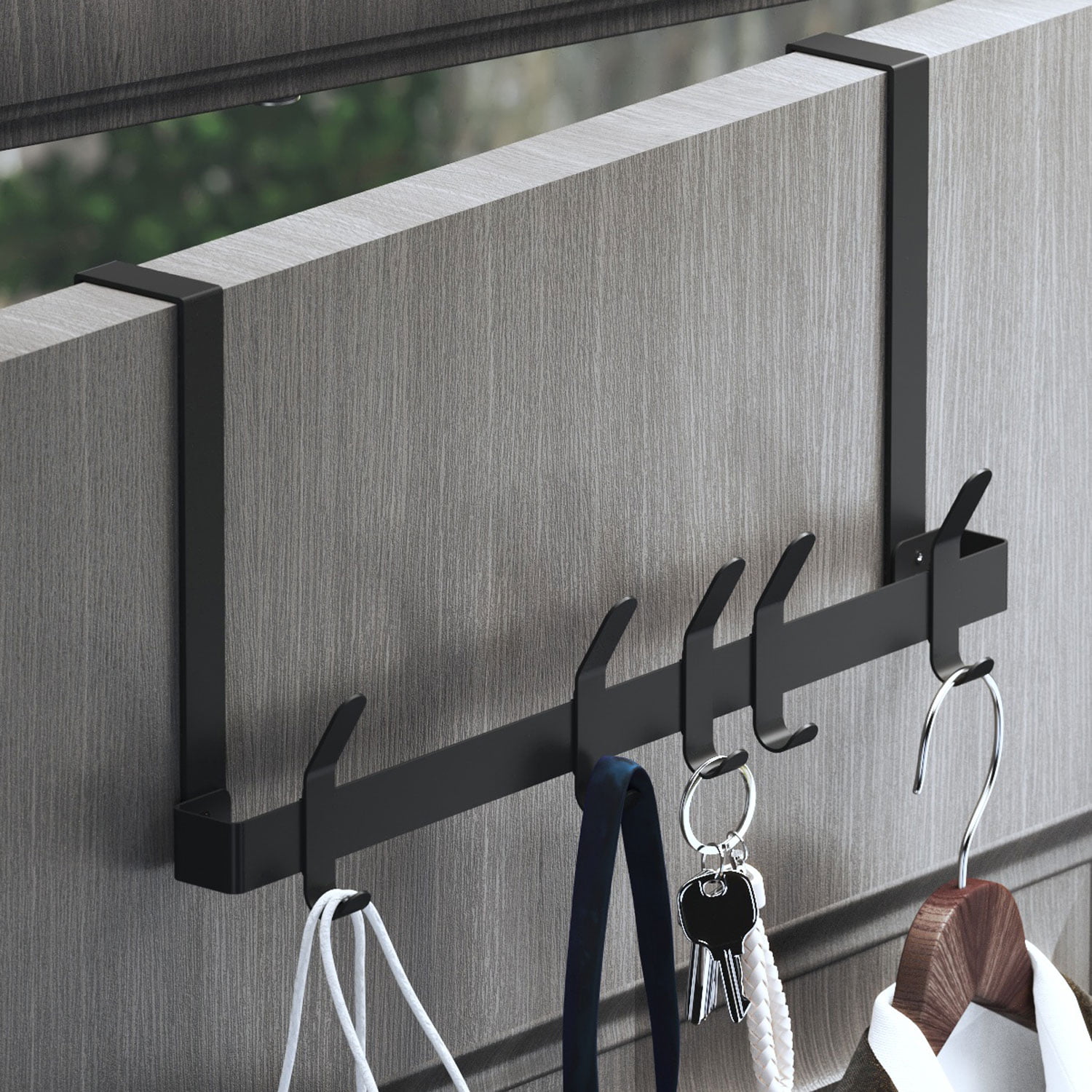 The coat organizer hanging is padded with sponge pads, so it will be very silent and won’t leave scratch on your door when you hang towels, coat, jacket, robe, hat, scarve, purse, key, dog leash, bag, backpack, mask, etc.