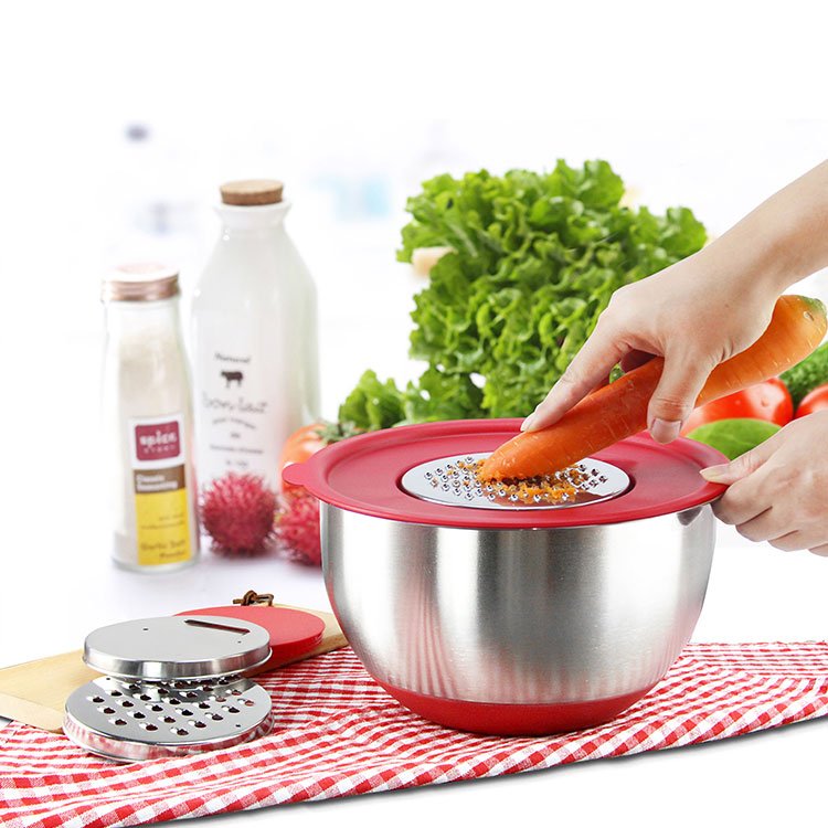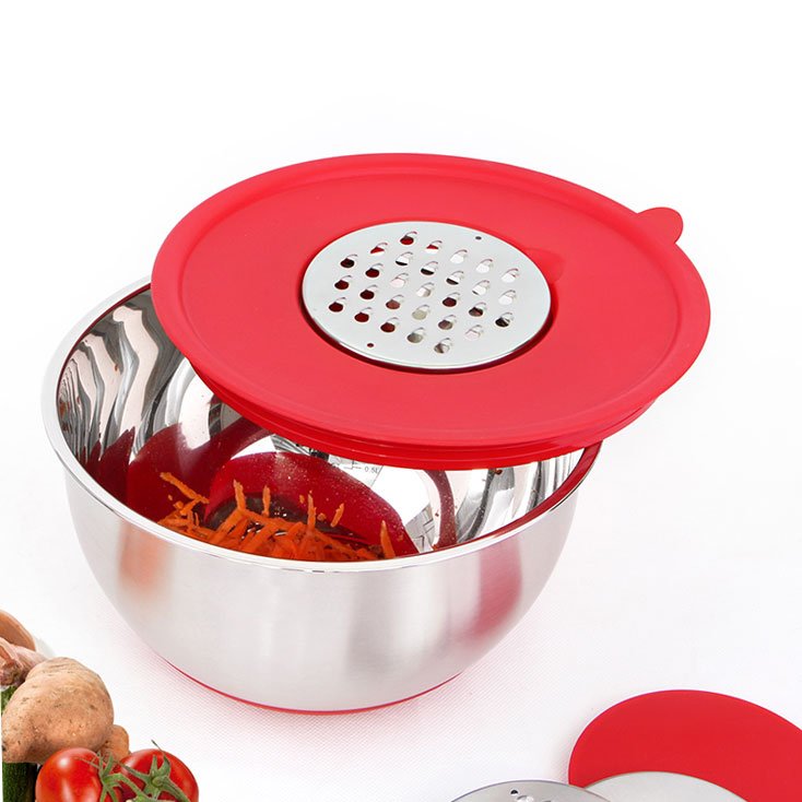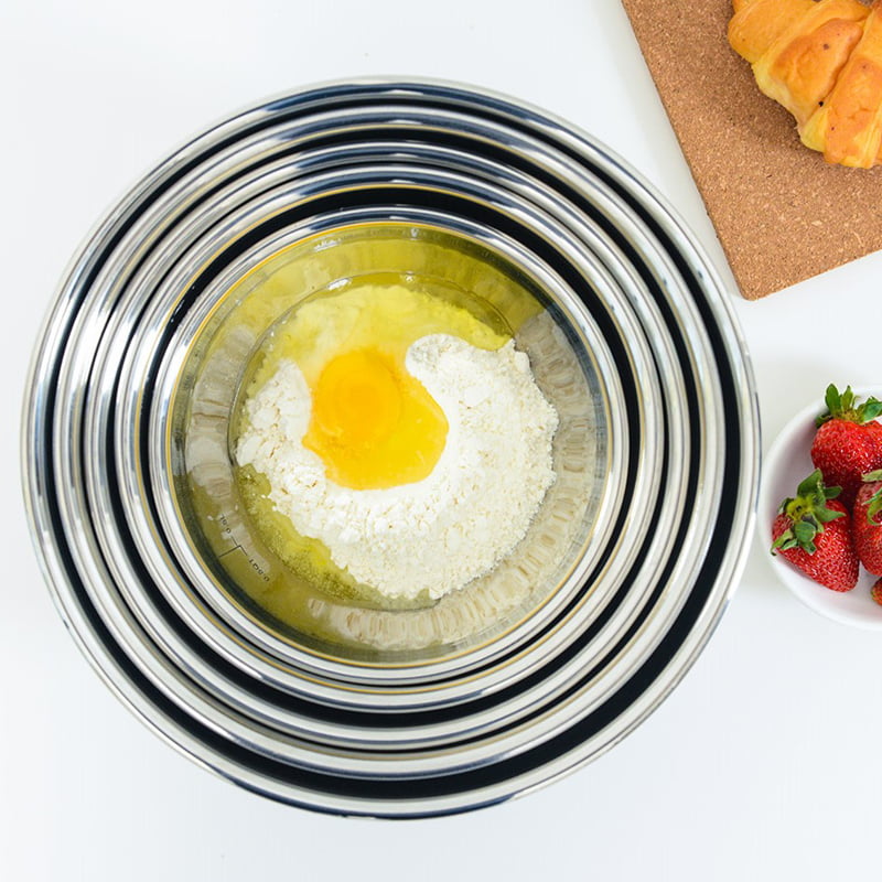 Mixing bowls is made of high-quality heavy gauge stainless steel, which is resistant and rustproof. Flat silicone bases prevent the metal bowls slippage when mixing, you need not to worry about the bowls will wobble when mixing, beating and whipping.